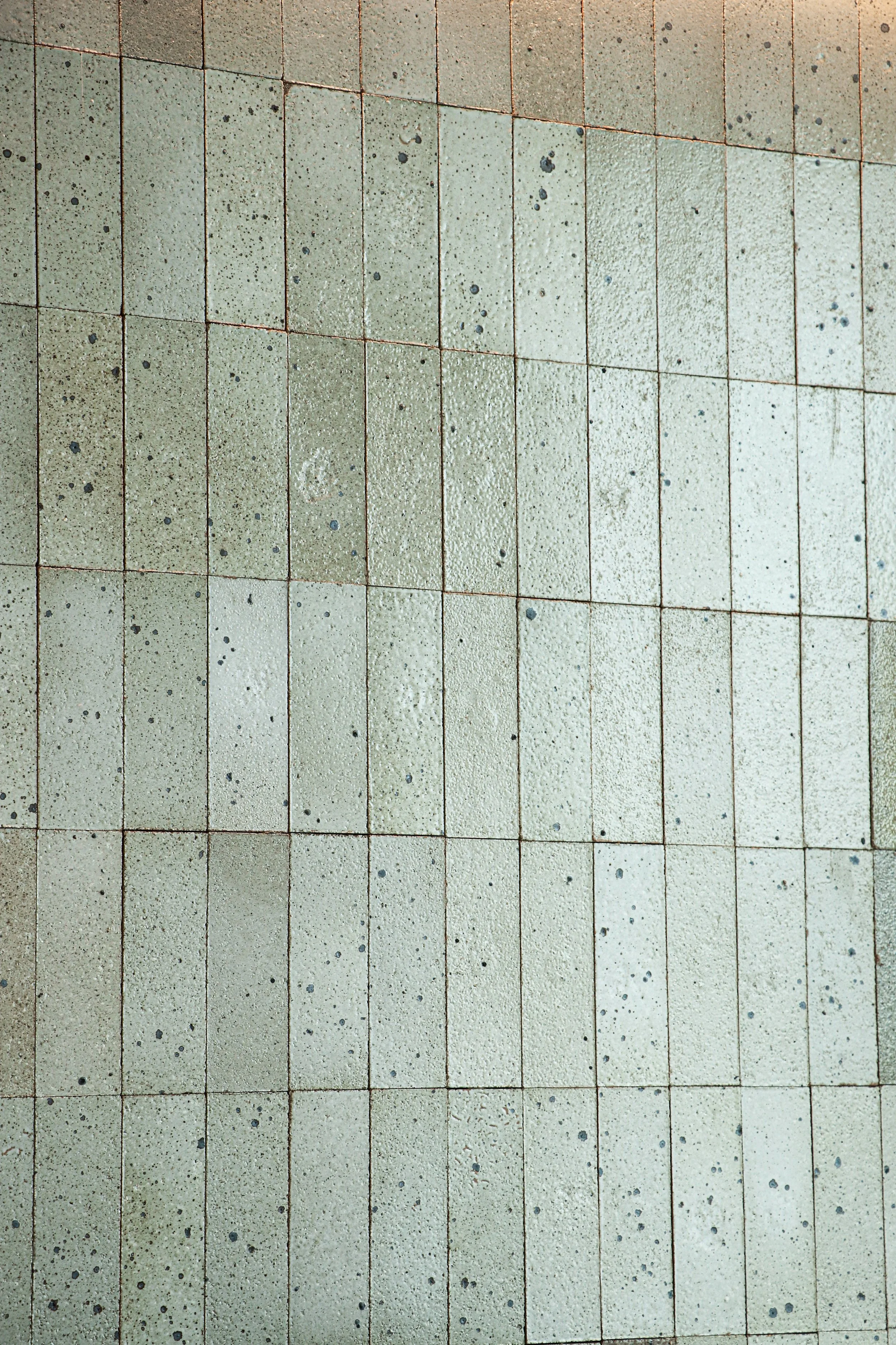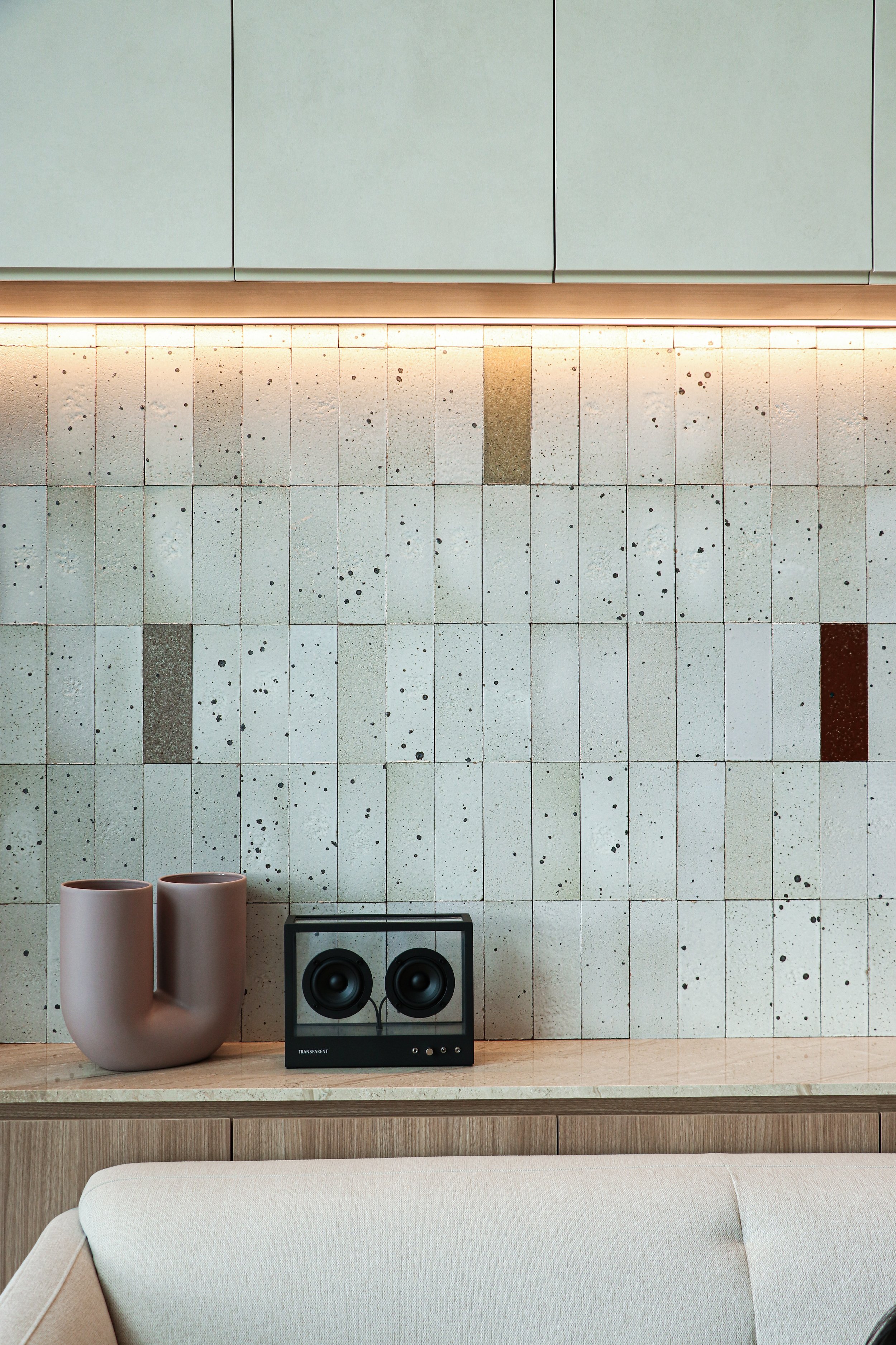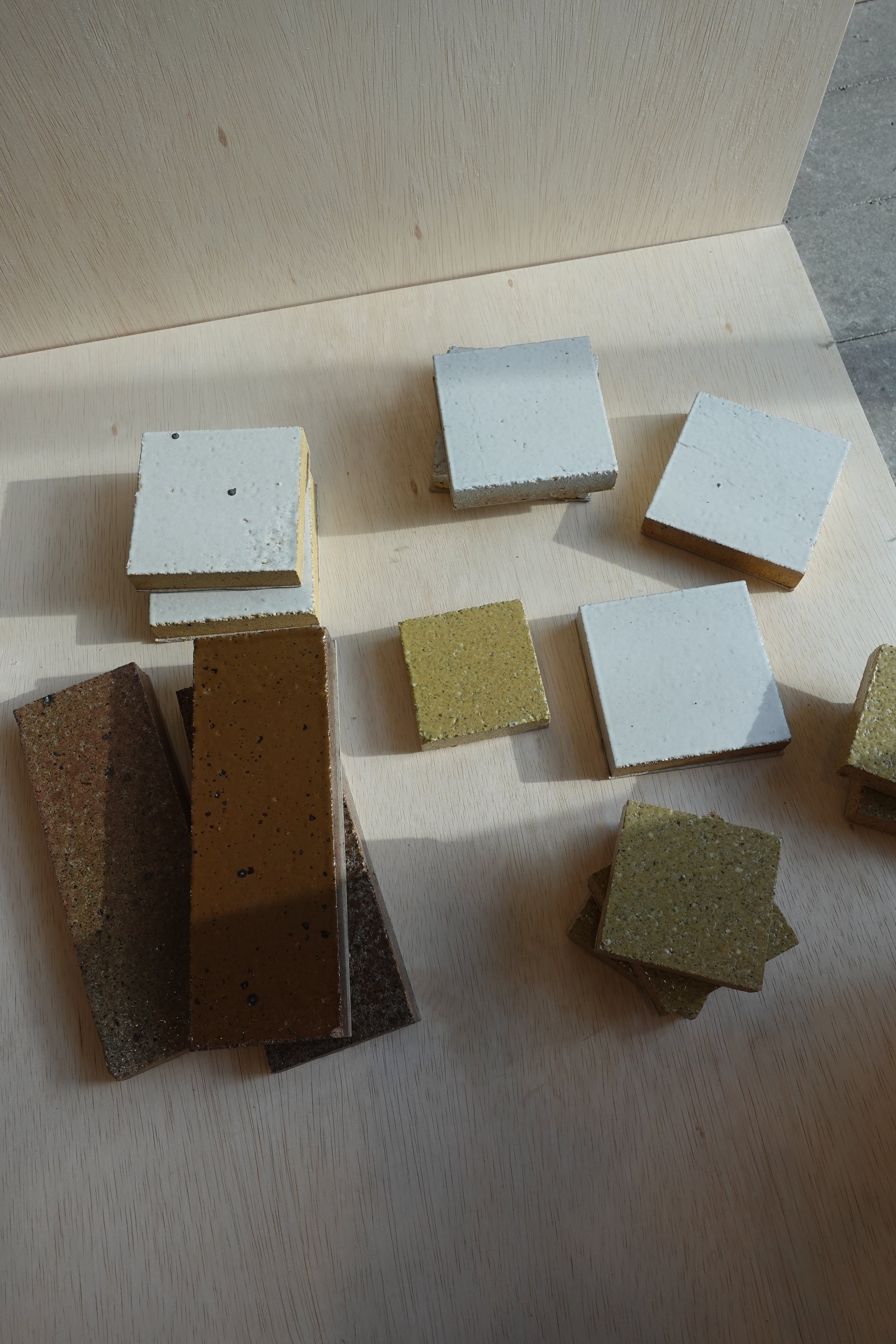 glazed tiles that offer a glossy finish while preserving the raw, textured character reminiscent of stone surfaces, tree bark, and bird eggs. Each tile features tiny specks of waste material scattered across the surface and within the body, creating a natural, organic character unique to every piece.