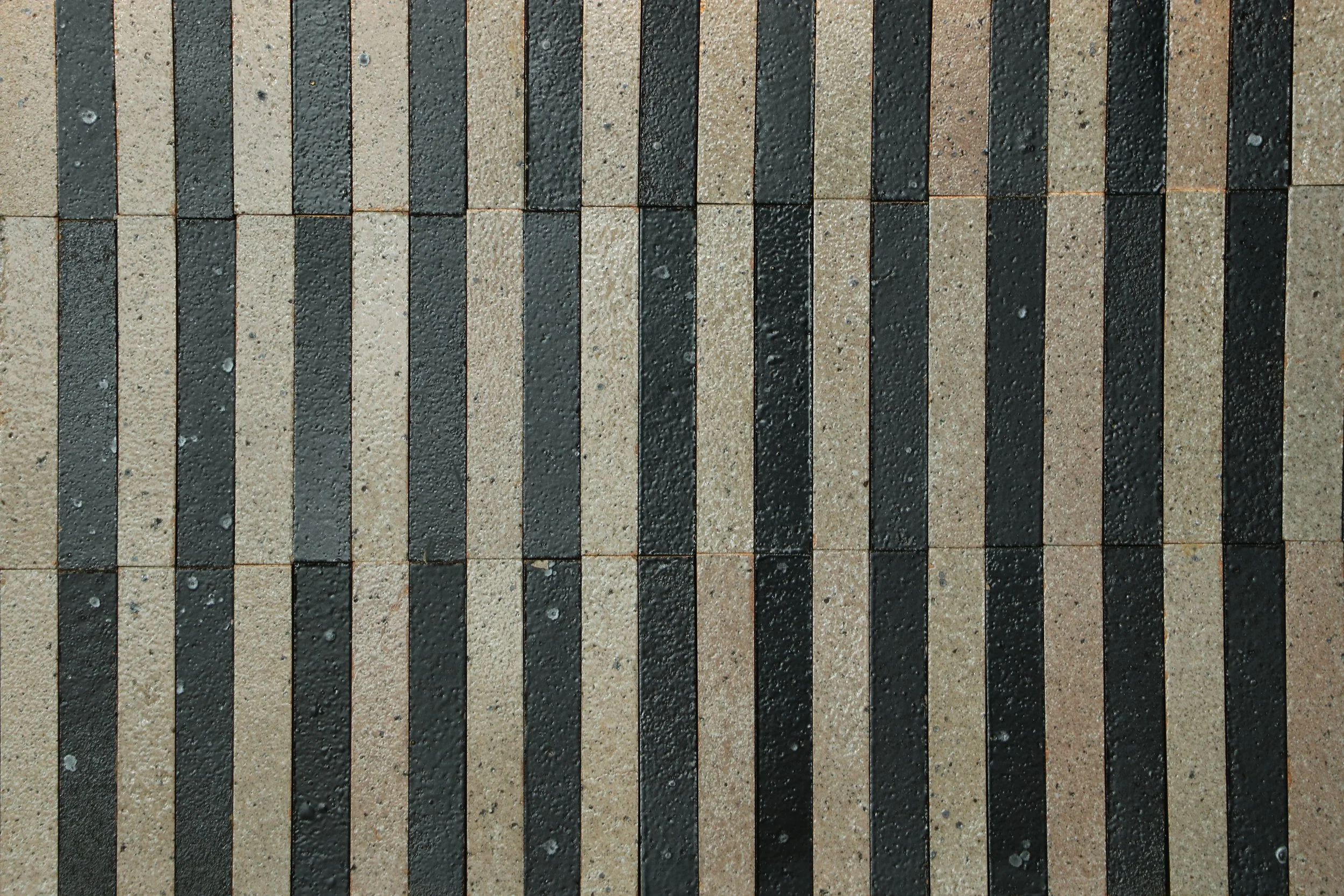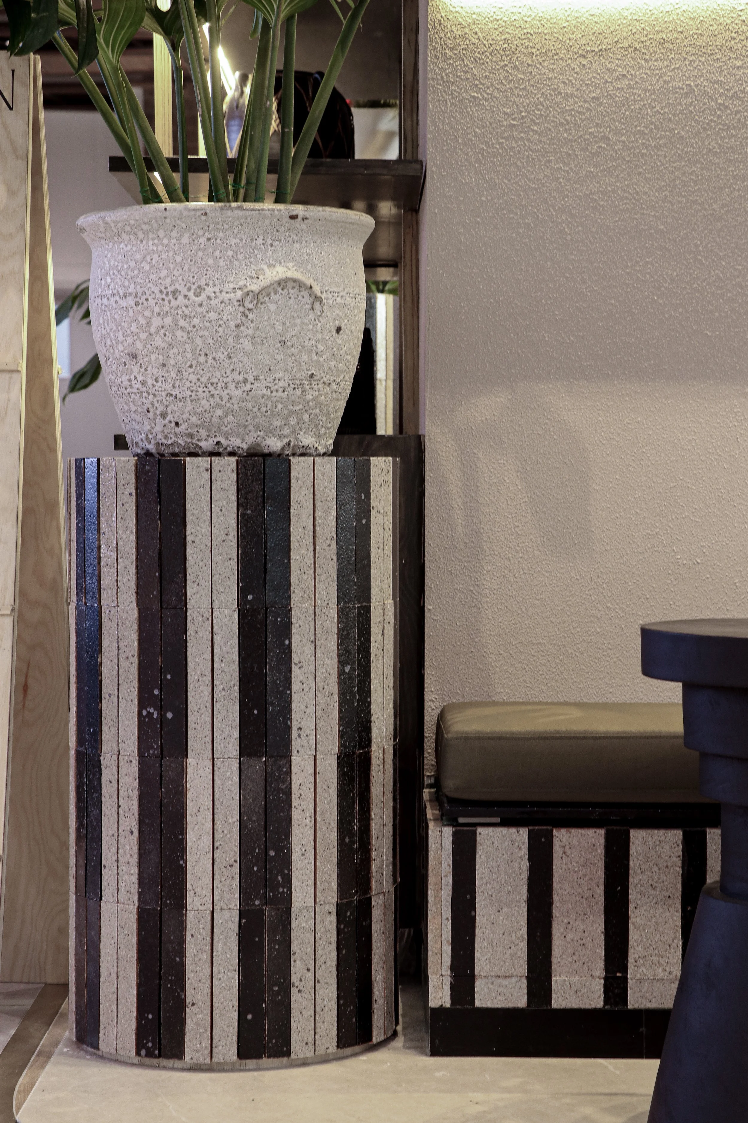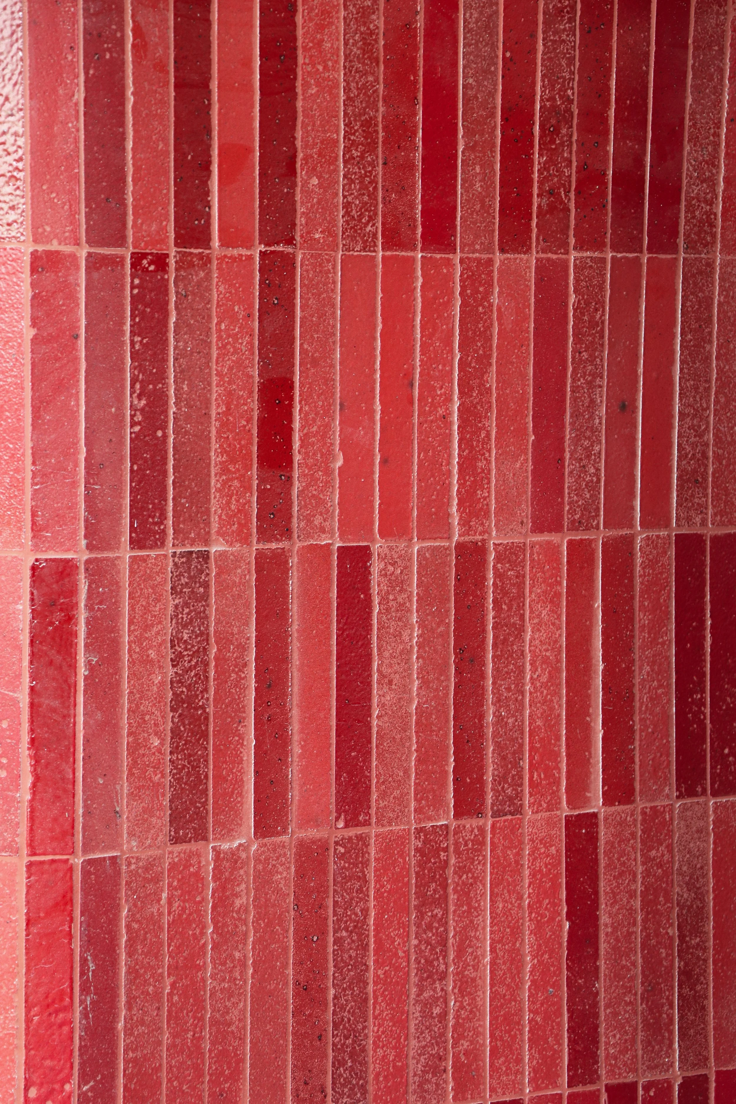 glazed tiles that offer a glossy finish while preserving the raw, textured character reminiscent of stone surfaces, tree bark, and bird eggs. Each tile features tiny specks of waste material scattered across the surface and within the body, creating a natural, organic character unique to every piece.