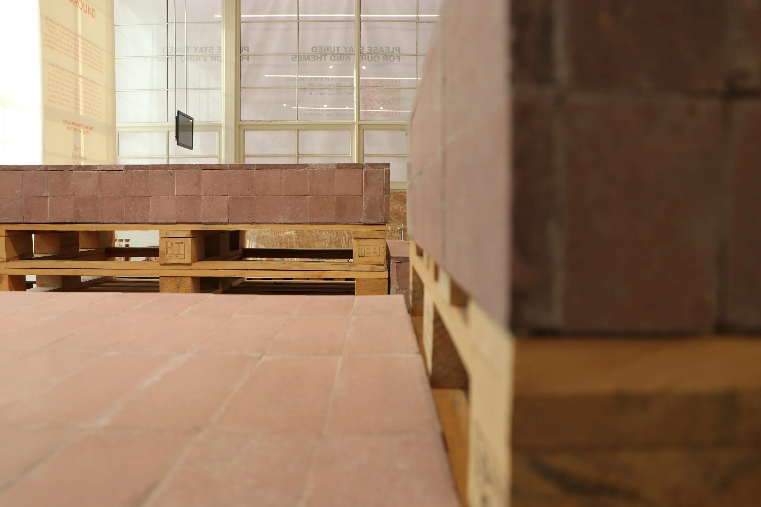 We used our grey unburnt tiles for the one section of the wall and floor so when coming in the first thing you see and experience is our tiles.The counter where the adjoining flower shop Plant House completes their orders is made from blue unburnt tiles. They were placed on top of two upcycled tables from a previous shop and transformed into one long counter for the shop. Burnt tiles were used to tile our bathroom, providing the room with a nice cooling effect as the cold air bounces off the walls.